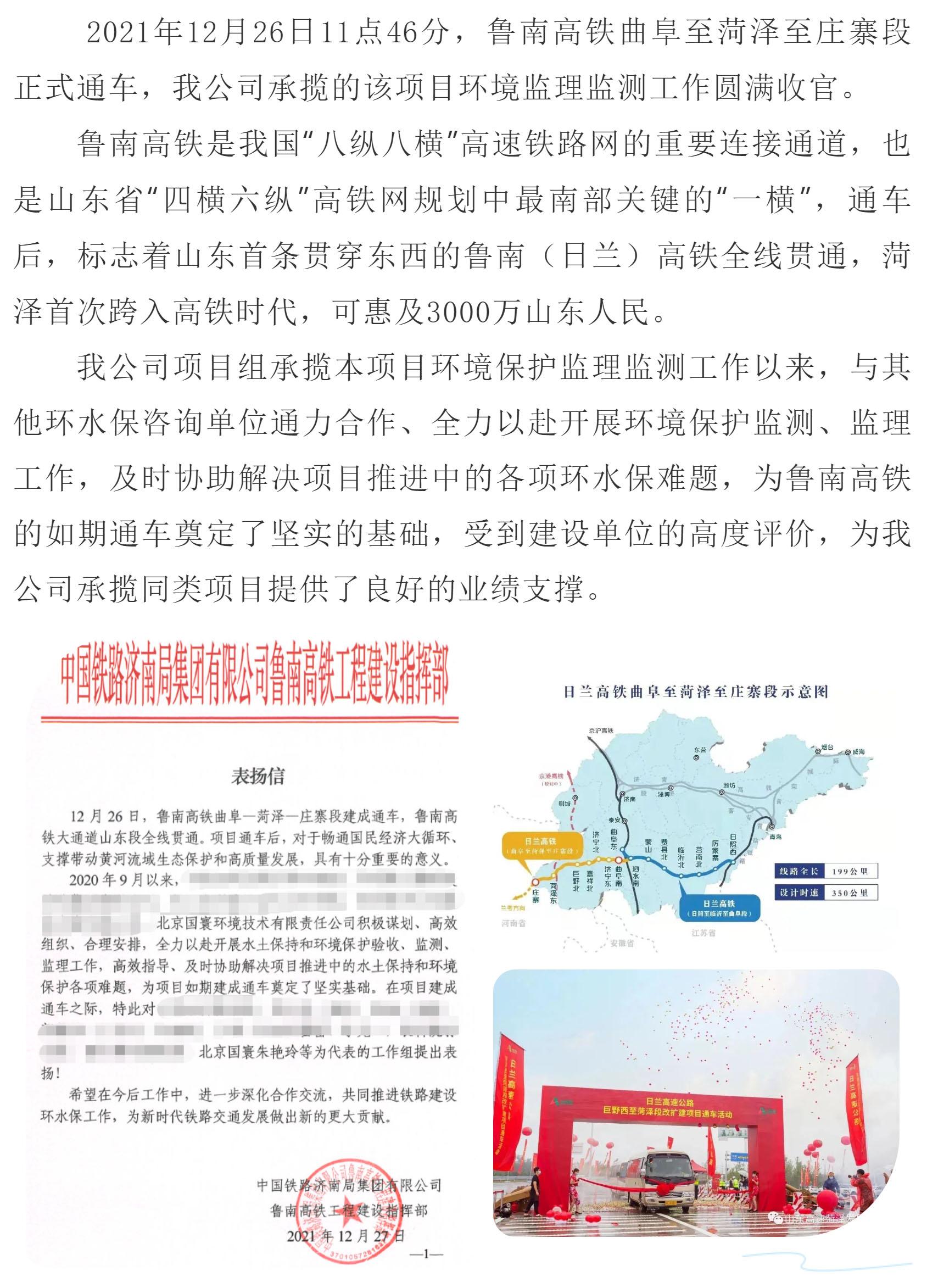 國寰公司承攬的魯南高鐵曲阜至菏澤至莊寨段環(huán)境監(jiān)理監(jiān)測工作圓滿收官