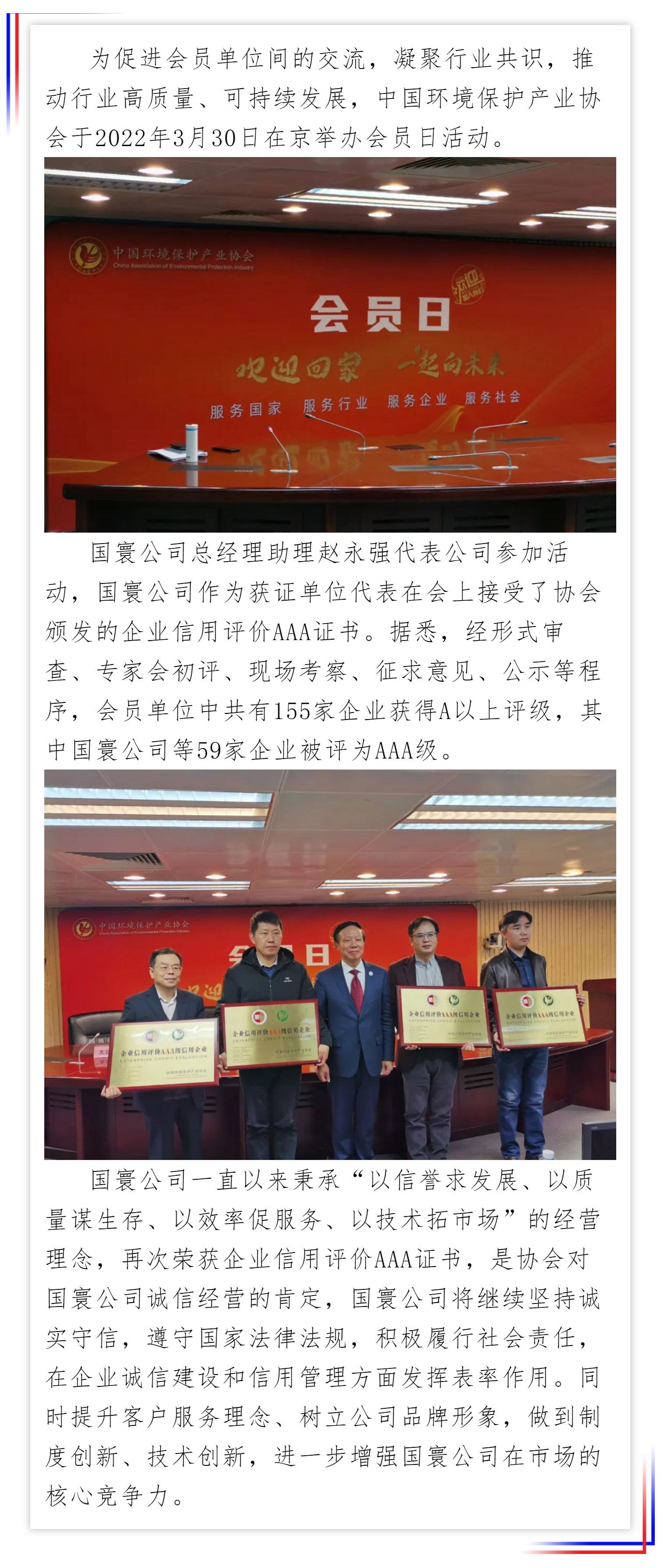 國寰公司以良好信譽繼續(xù)榮獲中國環(huán)境保護產(chǎn)業(yè)協(xié)會頒發(fā)的企業(yè)信用評價AAA證書